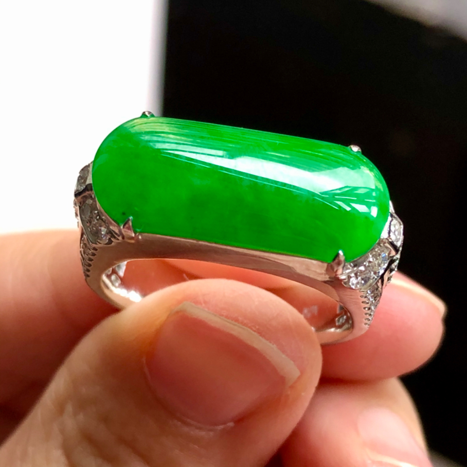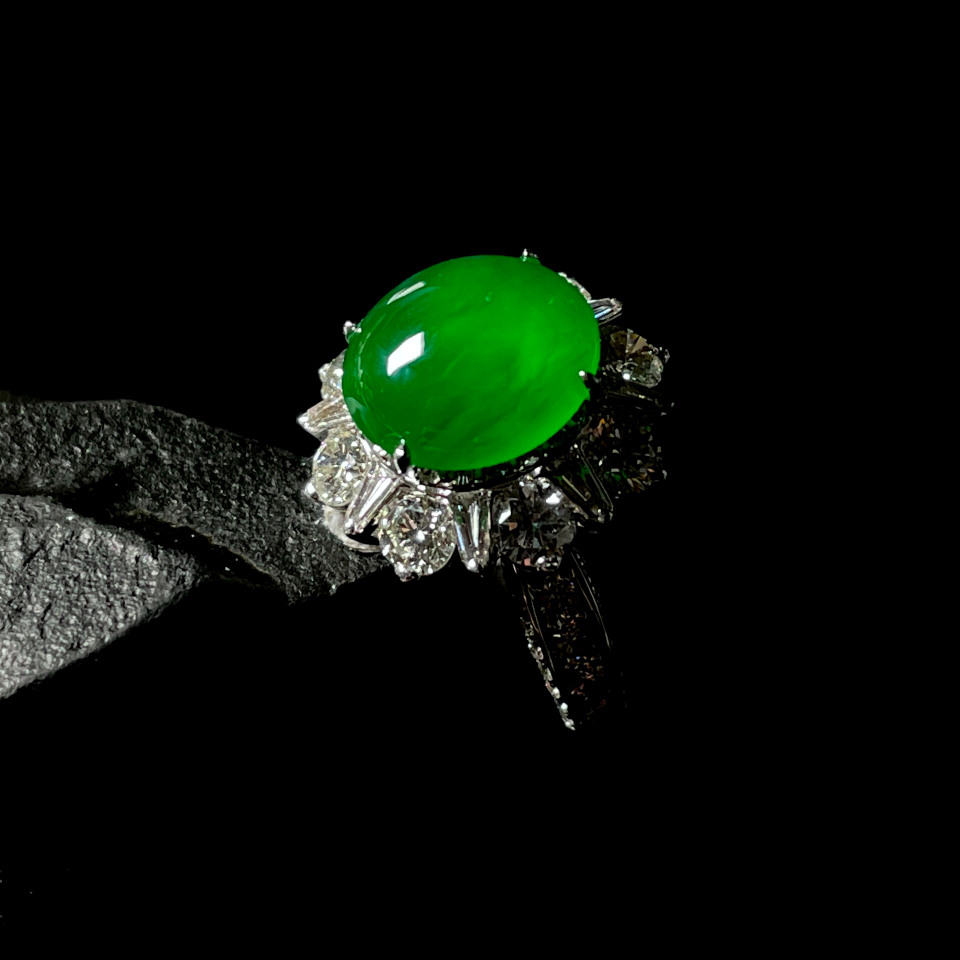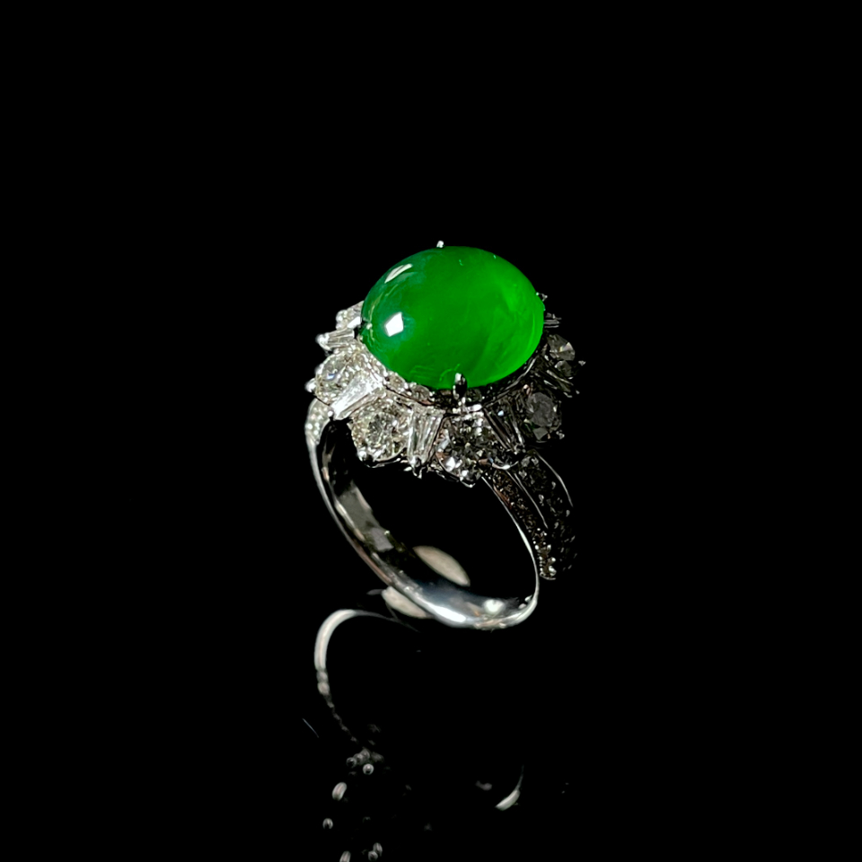 18K Gold Diamond Ring with Ice Sun Green Jadeite